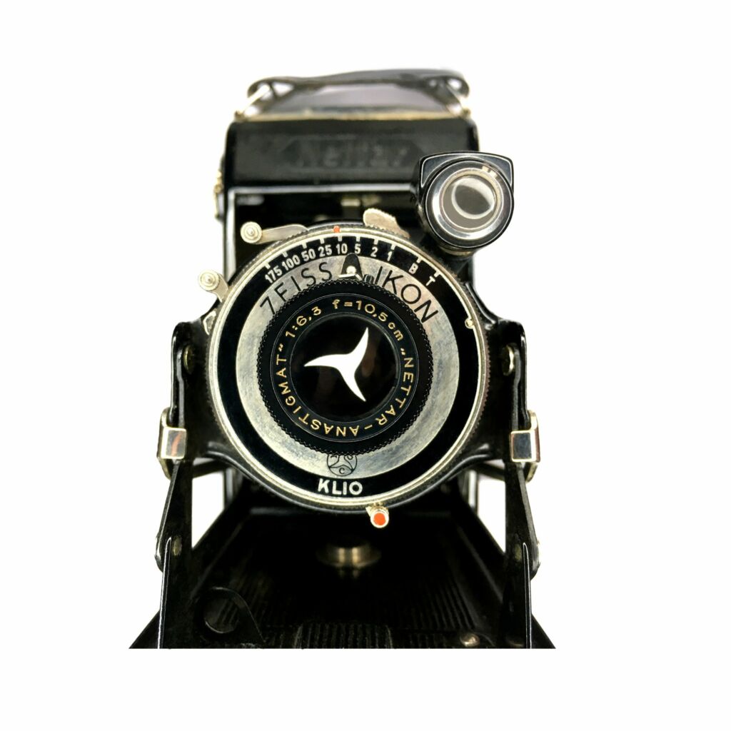 Geöffneter mechanischer Zentralverschluss einer Foto-Balgenkamera