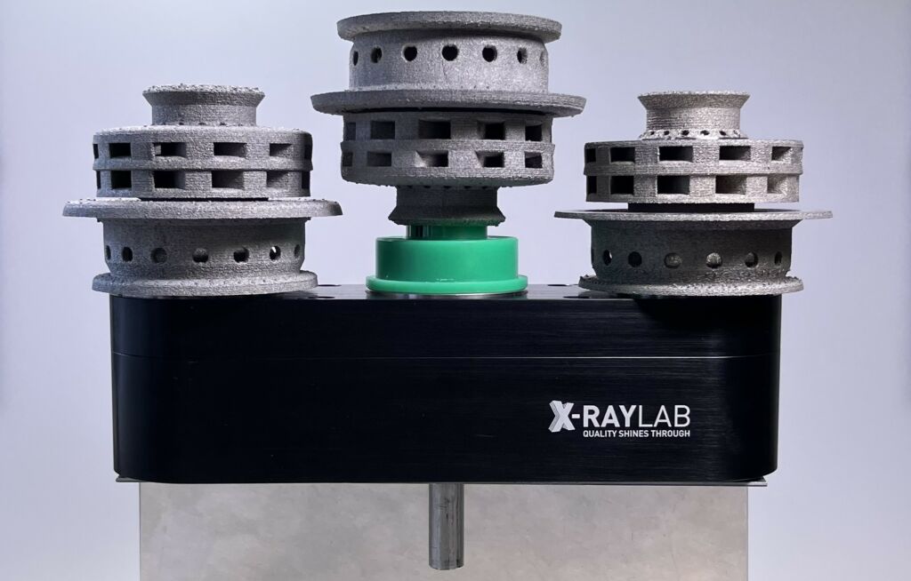 Mit Hilfe des am Fraunhofer-Entwicklungszentrum Röntgentechnik in Zusammenarbeit mit Xray-Lab entwickelten PolyCT Verfahrens ist es nun möglich, den Durchsatz konventioneller CT-Anlagen selbst für hochabsorbierende Proben um ein Vielfaches zu erhöhen. Das in nahezu jede beliebige industrielle CT-Anlage nachrüstbare Set verfügt in den Varianten M3 und L3 über drei einzelne Drehachsen für je eine Probe, die von der Hauptdrehachse des CT-Systems mechanisch angetrieben werden. Durch Rotation eines jeden Objekts um seine eigene Achse wird in jedem Projektionsbild die maximale Bildqualität erreicht, während der Durchsatz verdreifacht wird. Zusätzlich dazu kann die Winkelanzahl auf ein Minimum gesenkt werden da die überschatteten Detektorbereiche, jeder für sich als Maß für die Winkelanzahl fungieren. Die Betriebsparameter der Röntgenröhre können ebenso auf ein Minimum, dass zur Durchdringung einer Probe nötig ist, reduziert werden was zu einer höheren Lebensdauer der Komponenten des CT-Systems führt. Mit dem Einsatz des PolyCT Verfahrens lässt sich der Scan-Durchsatz im Vergleich zum konventionellen Mehrfachscan um mehr als den Faktor 3 erhöhen.Ein aktuelles Beispiel aus der Praxis stellt die Anwendung an Triebwerkseinspritzdüsen aus Titan dar, bei der durch den Einsatz die Messzeit für einen Scan von etwa 30 auf 10 Minuten reduziert werden konnte bei gleichzeitig gesteigerter Bildqualität und schonenderer Betriebsweise der Röntgenanlage durch Anwendung von 220 kV anstelle 320 kV.