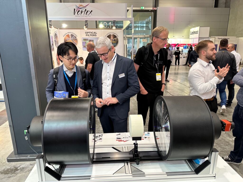 Vision & Control hat auf der Vision ein außergewöhnlich großes, optisches System vorgestellt. Es handelt sich um ein telezentrisches Grossfeldobjektiv und dem dazu passenden Grossfeldobjektiv, das als telezentrische Beleuchtung eingesetzt wird. Anstelle einer hinteren Optik ist eine Beleuchtung mit einer Blende eingesetzt. Mit diesem Aufbau kann z.B. ein Katalysatorblock mit Tausenden von Löchern hinsichtlich Durchgängigkeit der Bohrungslöcher inspiziert werden.