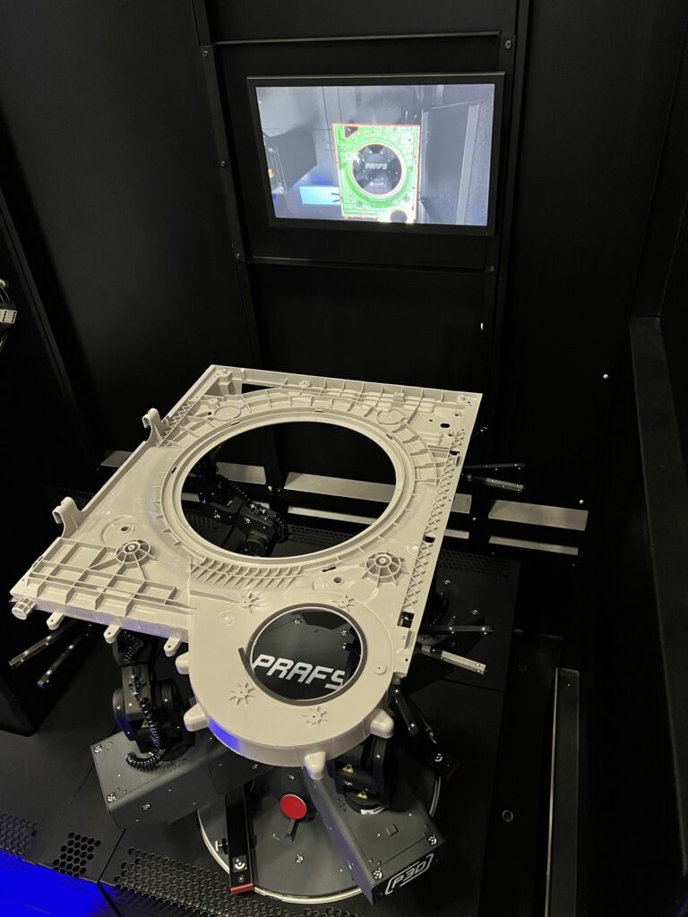 Während die erste PRAFS Variante 3620 mit sechs Robotern für Bauteile bis zu 3.000mm ausgelegt ist, kommen mit den neuen Modellen 2410 und 2414 nun kompaktere Systeme auf dem Markt. Diese sind für Bauteilgrößen von maximal 1.000 bzw. 1.400mm konzipiert. Beide Modelle arbeiten mit vier Robotern als Bauteilauflage. Es sind mobile, automatisierte Vorrichtungen, die mit Hilfe eines Hebewerkzeuges schnell auf dem Drehteller der ScanBox platziert und befestigt werden. Mit nur einem Stecker lässt sich PRAFS anschließen und aktivieren. Die Bauteildaten werden zuerst in die Zeiss-Inspect Software übertragen und dort mit den vorhandenen Tools über der PRAFS positioniert. Anschließend erfolgt die Programmierung in der Emusim-Software, wo die zwei, drei oder vier Roboter-Auflagepositionen innerhalb weniger Minuten festgelegt werden – ganz ohne Roboterpanel oder spezielle Programmierkenntnisse.