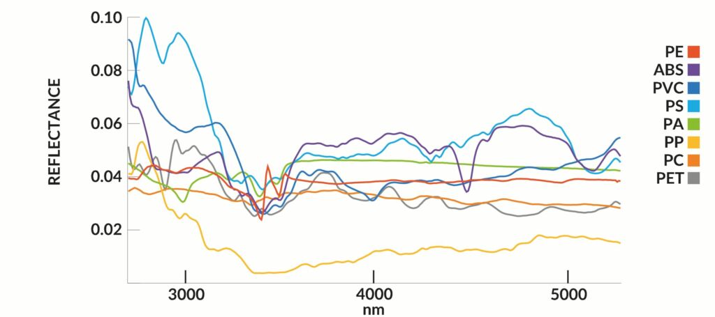 Hier kommt die Hyperspektrale Bildverarbeitung (Hyperspectral Imaging, HSI) im mittleren Infrarotbereich (MWIR) ins Spiel: Während herkömmliche NIR-Systeme im Wellenlängenbereich von 0,9 bis 1,7µm arbeiten und schwarze Kunststoffe aufgrund der lichtabsorbierenden Ruß-Pigmente nur schwer erkennen können, arbeitet MWIR HSI im Spektralbereich von 3 bis 5µm und eröffnet damit neue Möglichkeiten zur Materialidentifizierung. Im MWIR-Bereich weisen Kunststoffe aufgrund ihrer molekularen Zusammensetzung unterschiedliche spektrale Merkmale auf. Dadurch ist es möglich, verschiedene Kunststoffe unabhängig von ihrer Farbe zu unterscheiden. Selbst schwarze Kunststoffe können damit zuverlässig identifiziert werden, da ihre Molekularstrukturen das Licht im MWIR-Spektrum unterschiedlich reflektieren. Durch die Erfassung der spektralen Details ermöglicht MWIR HSI eine genaue, optische Sortierung von schwarzen Kunststoffen in Echtzeit, wodurch die Recyclingeffizienz erheblich gesteigert wird.